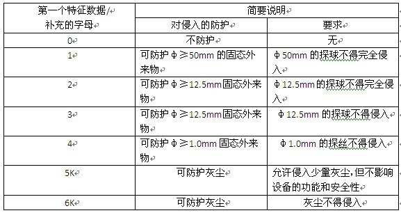 DIN 40050-9 公路車防護(hù)要求-防塵試驗(yàn)標(biāo)準(zhǔn)中規(guī)定了對外來物的防護(hù),要求同樣的防護(hù)級別(同樣的特征數(shù)據(jù))。在這種情況下,只能用第一個特征數(shù)據(jù)來表示這種防護(hù)類型。具體內(nèi)容見下表。