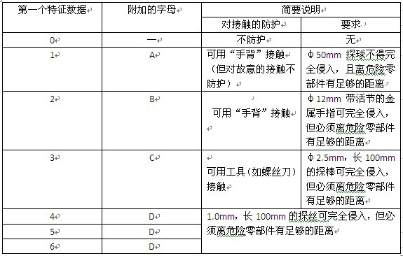 備注:接觸防護的級別比通過第1個特征數(shù)據(jù)所標注的要高,或者只應該標注接觸防護的級別(第一個特征數(shù)據(jù)通過X來代替)。通過對接觸防護,只標注一個防護級別,可以將有關的更低的防護級別包括進去。